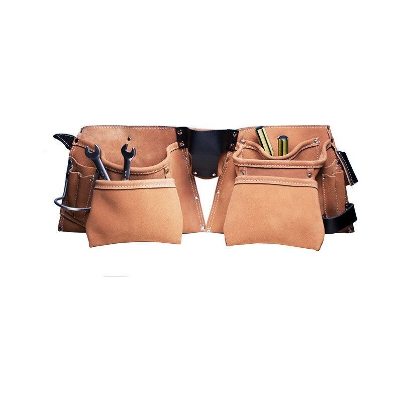 Der Dachdecker-Gürtel N-126 für Profis, gefertigt aus 2,0–2,2 mm dickem, natürlichem Velours-Rindsleder. Er verfügt über zwei große Montagetaschen mit den Maßen 280×220 mm, zwei hängende Außentaschen 180×120 mm, eine Innentasche 160×120 mm, eine mittlere Tasche für ein Rollmaßband, zwei kleine Taschen 80×120 mm sowie vier Taschen für Schraubendreher, Markierungsstifte, Bohrer usw., eine Metallhalterung für einen Dachdeckerhammer und eine zusätzliche Lederhalterung für einen Hammer oder eine Schere.